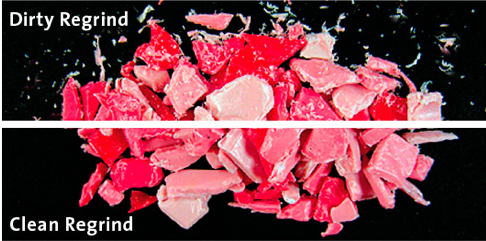 Selbst bei der angeblich sauberen Neuware entstehen spätestens bei der Förderung und beim Handling vor der Verarbeitung Feinststäube, die gerade bei optisch anspruchsvollen Sichtteilen zu verstärktem Ausschuss in Form von z.B. schwarzen Punkten führen können. Wir bieten die patentierte Lösung, wobei bei der Entstaubung auch die kleinsten Feinststäube, welche in der Regel an der Granulatoberfläche haften, entfernt werden.